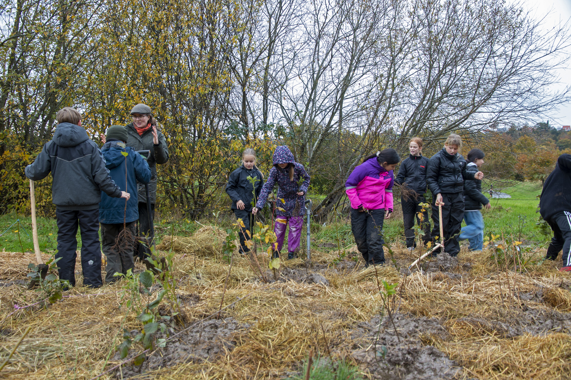 Alle elever fra to 5. klasser fra Bakkeskolen har plantet skoven, som er på 50 kvadratmeter.