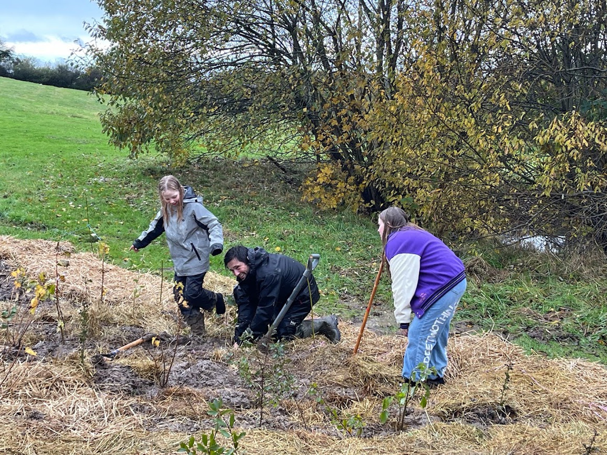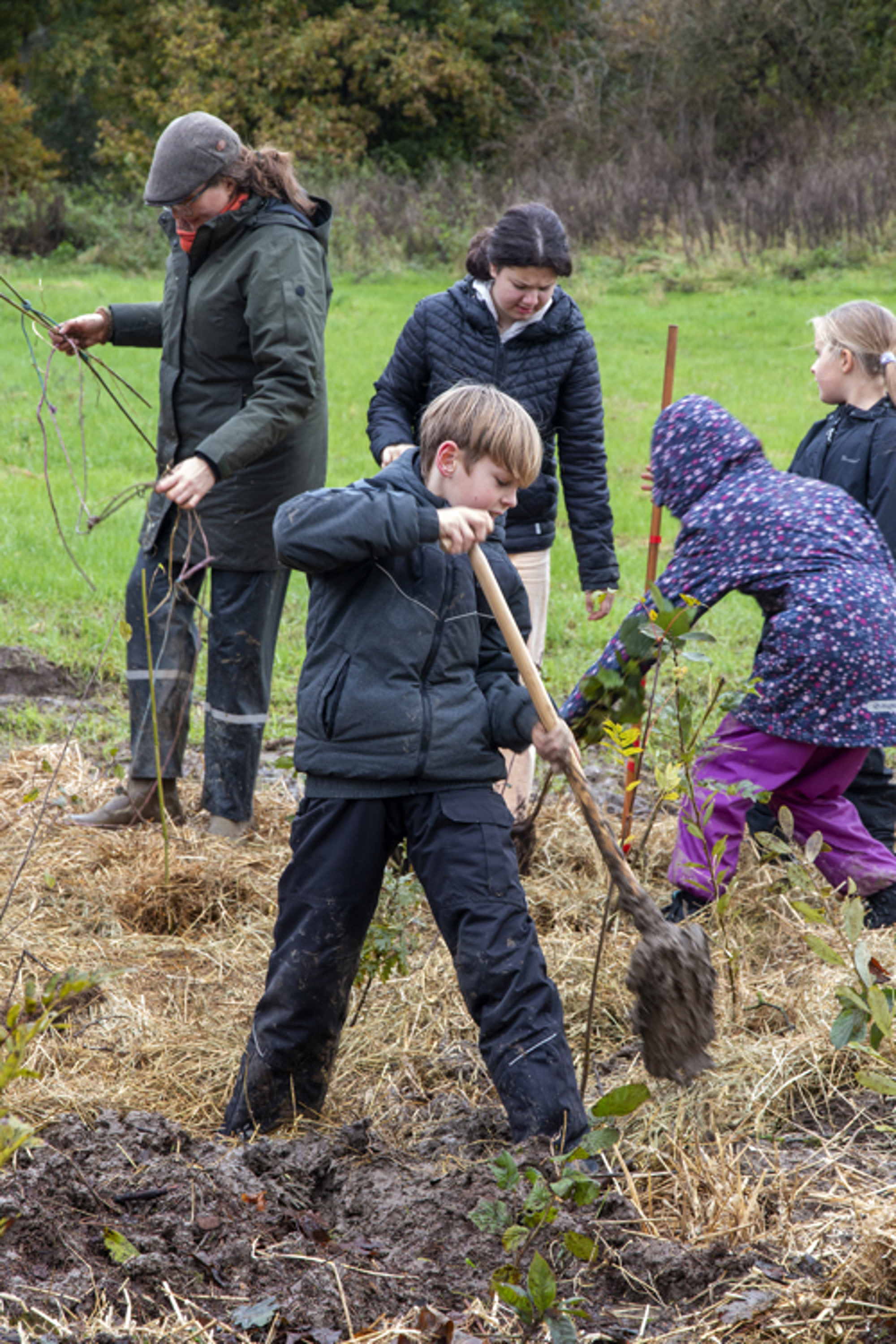 På dagen for plantningen var jorden meget blød, da det havde regnet i en lang periode, så vi lagde stempelslag fra bigballer ud, altså plader af sammenpresset halm, som vi gik på for ikke at synke i, når træerne skulle plantes.