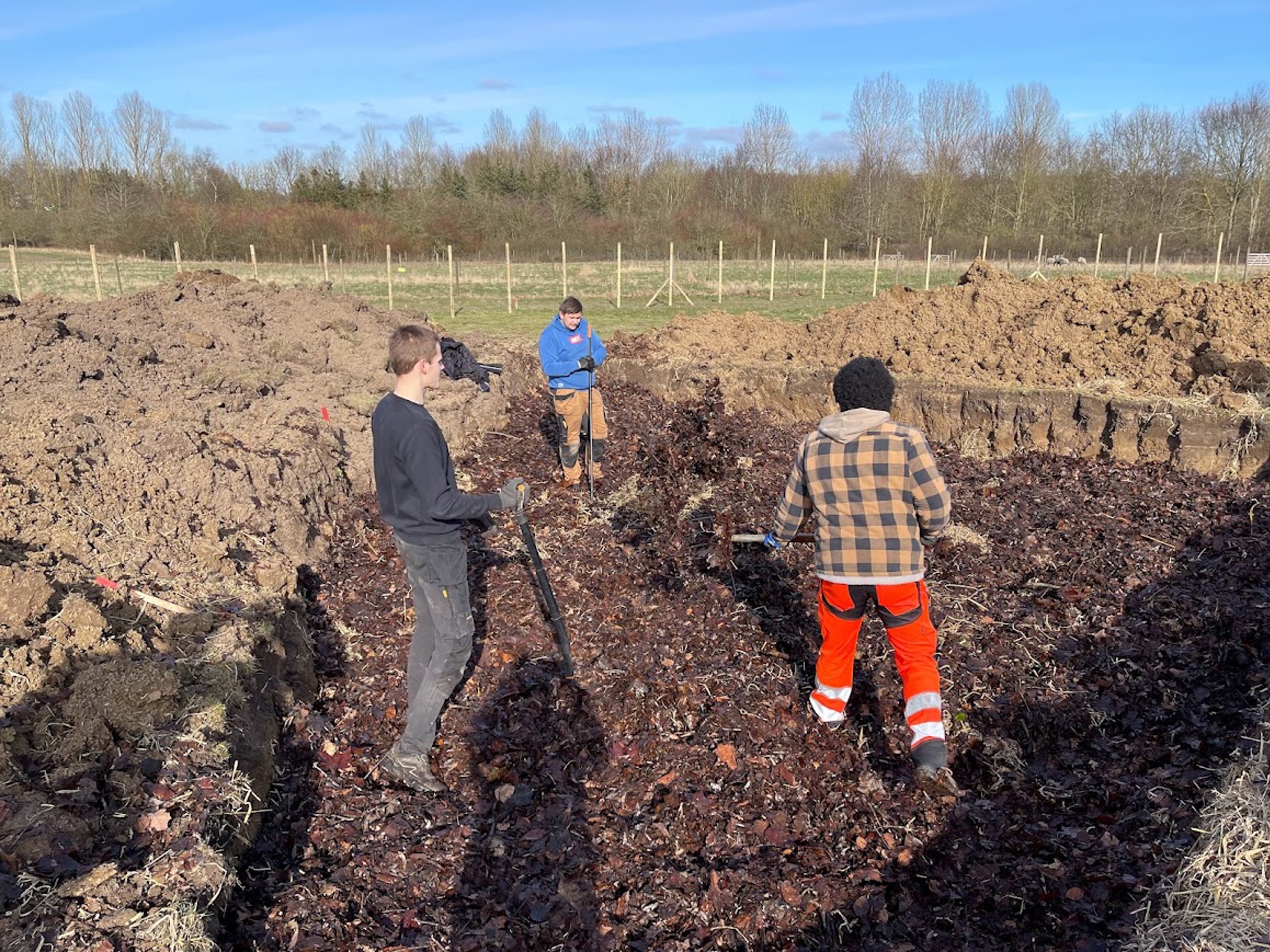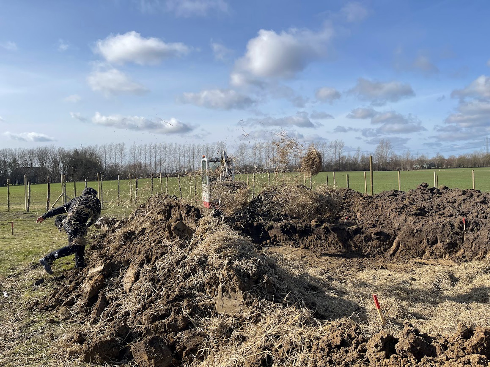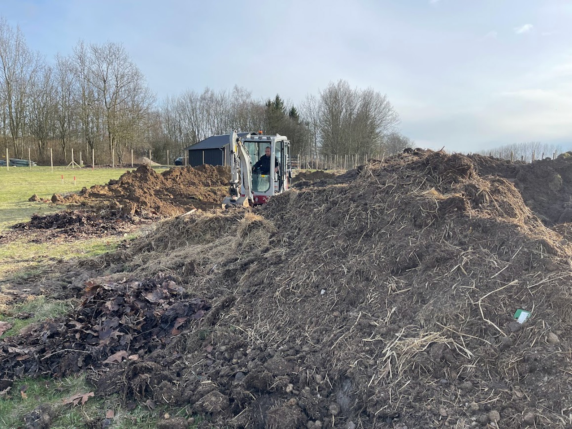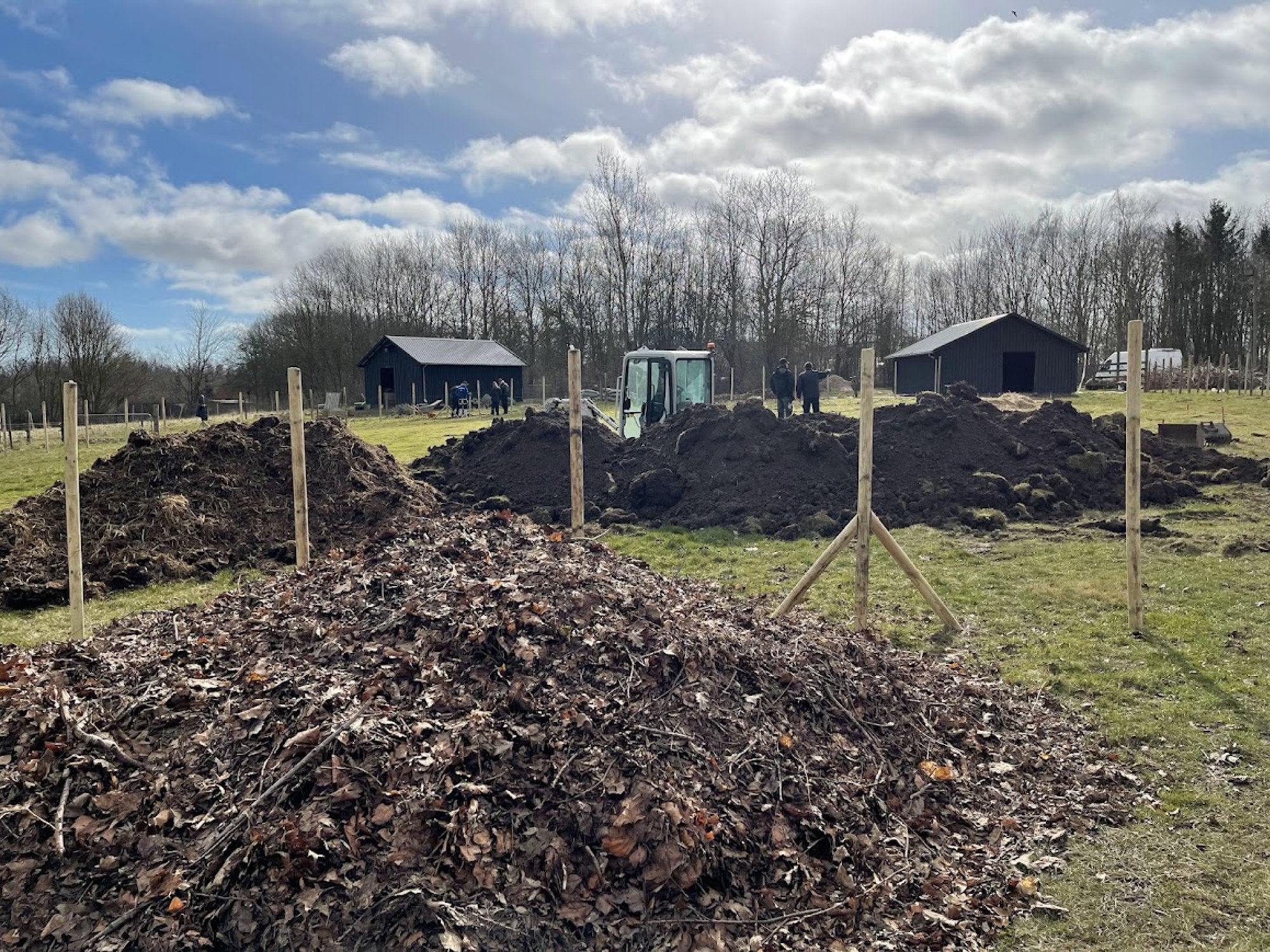 Der blev gravet 70 cm ned, hvor bladkompost og halm blev blandet 30 cm ned i jorden. Halvdelen af jorden er blev lagt tilbage i hullet og vendt med hestemøg.