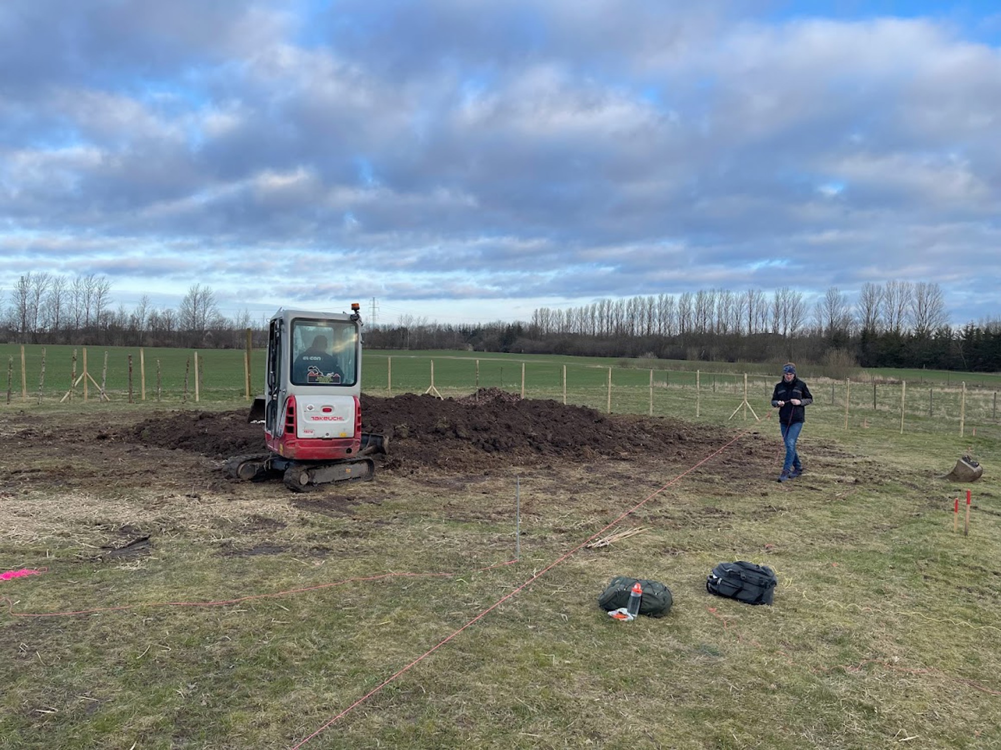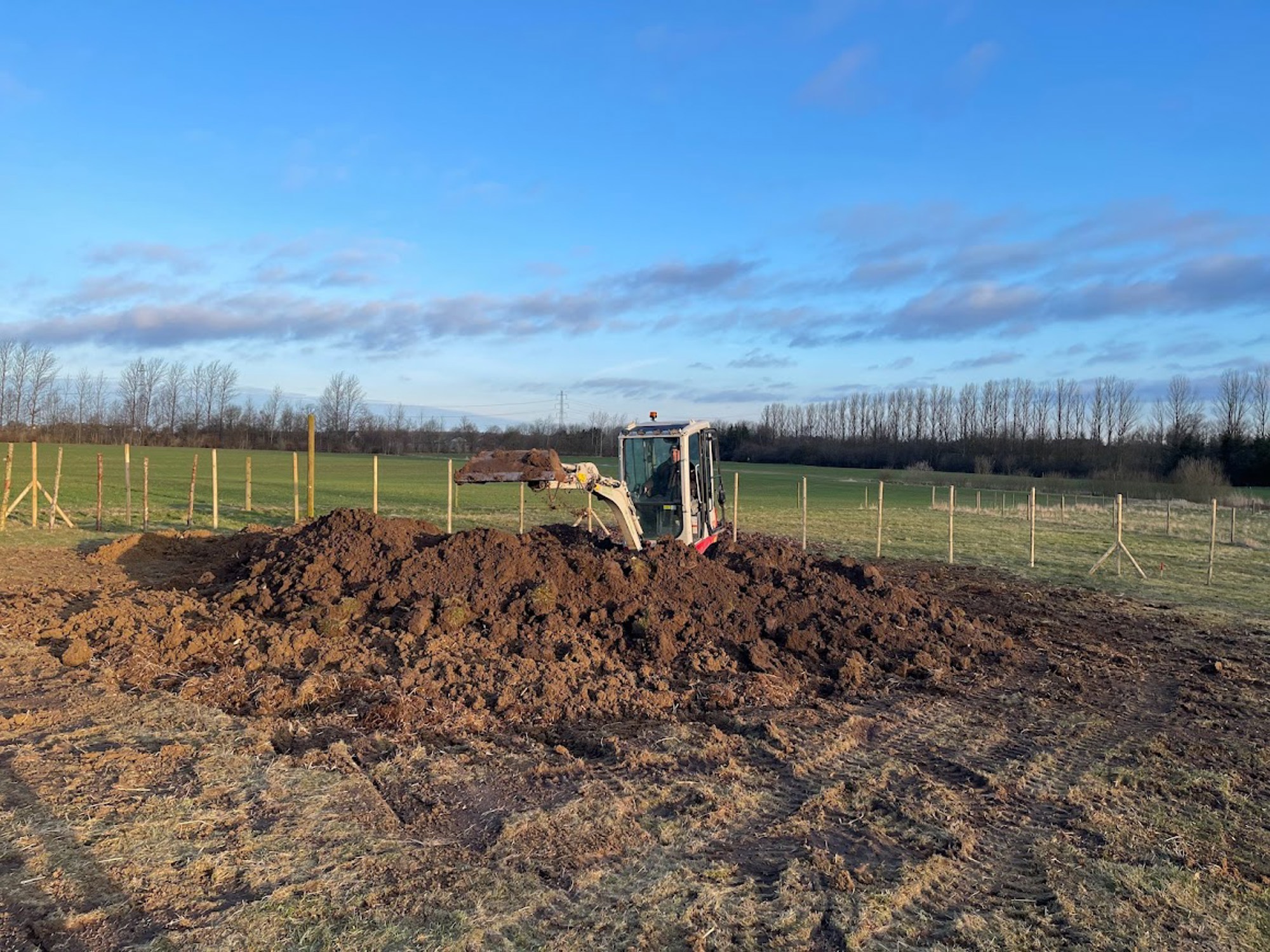 De øverste 30-40 cm græstørv blev vendt ned med en gravemaskine med tremmeskovl, så jorden kunne slippe. Græsset skulle vendes, så det ikke gror op og kommer til at konkurrere med træerne.