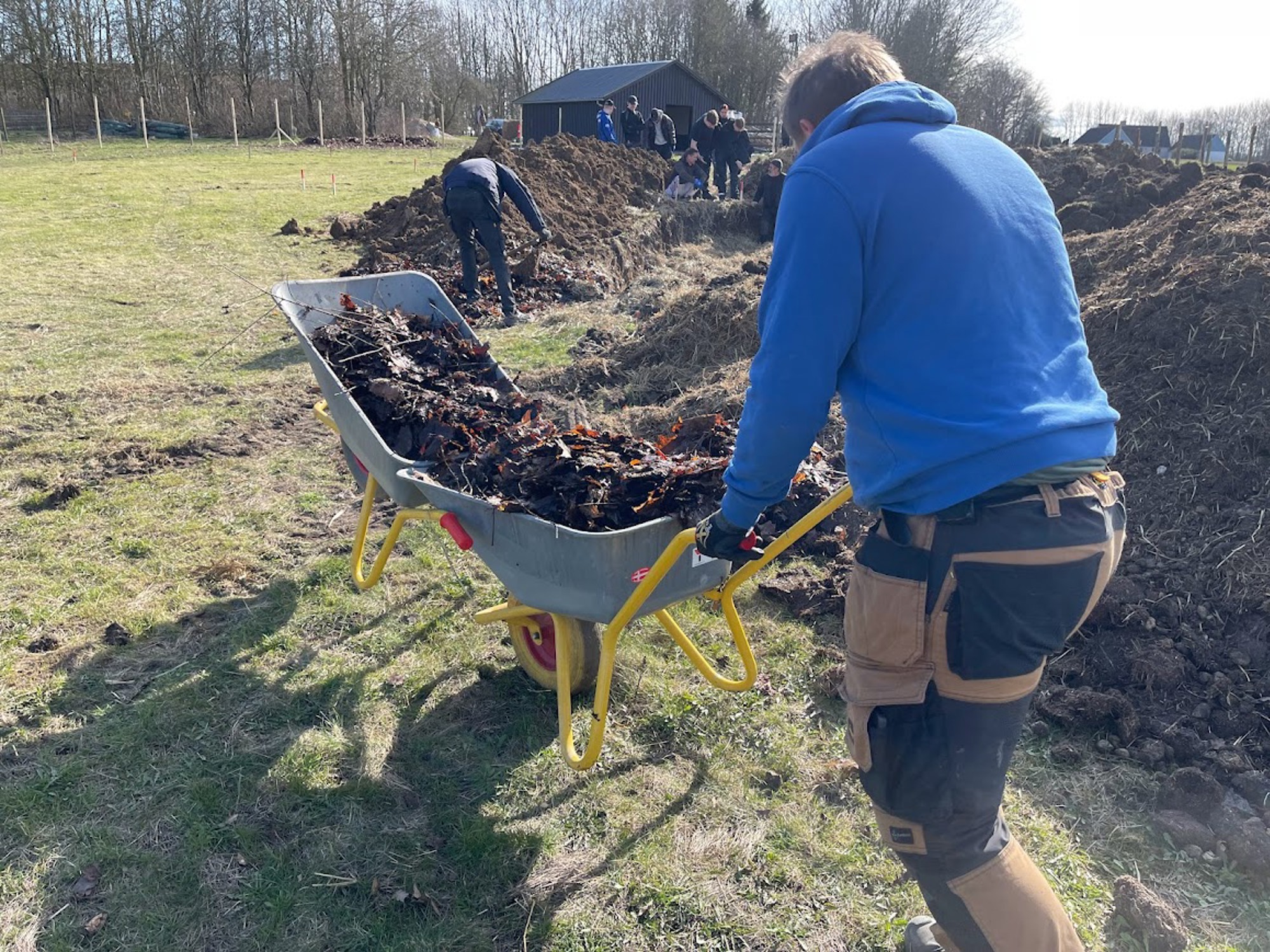 Halvt omsat hestemøg blev spredt ud over området og derefter fræset ned, men først skulle der lige være styr på at alle græstørv vendte med græssiden nedad.